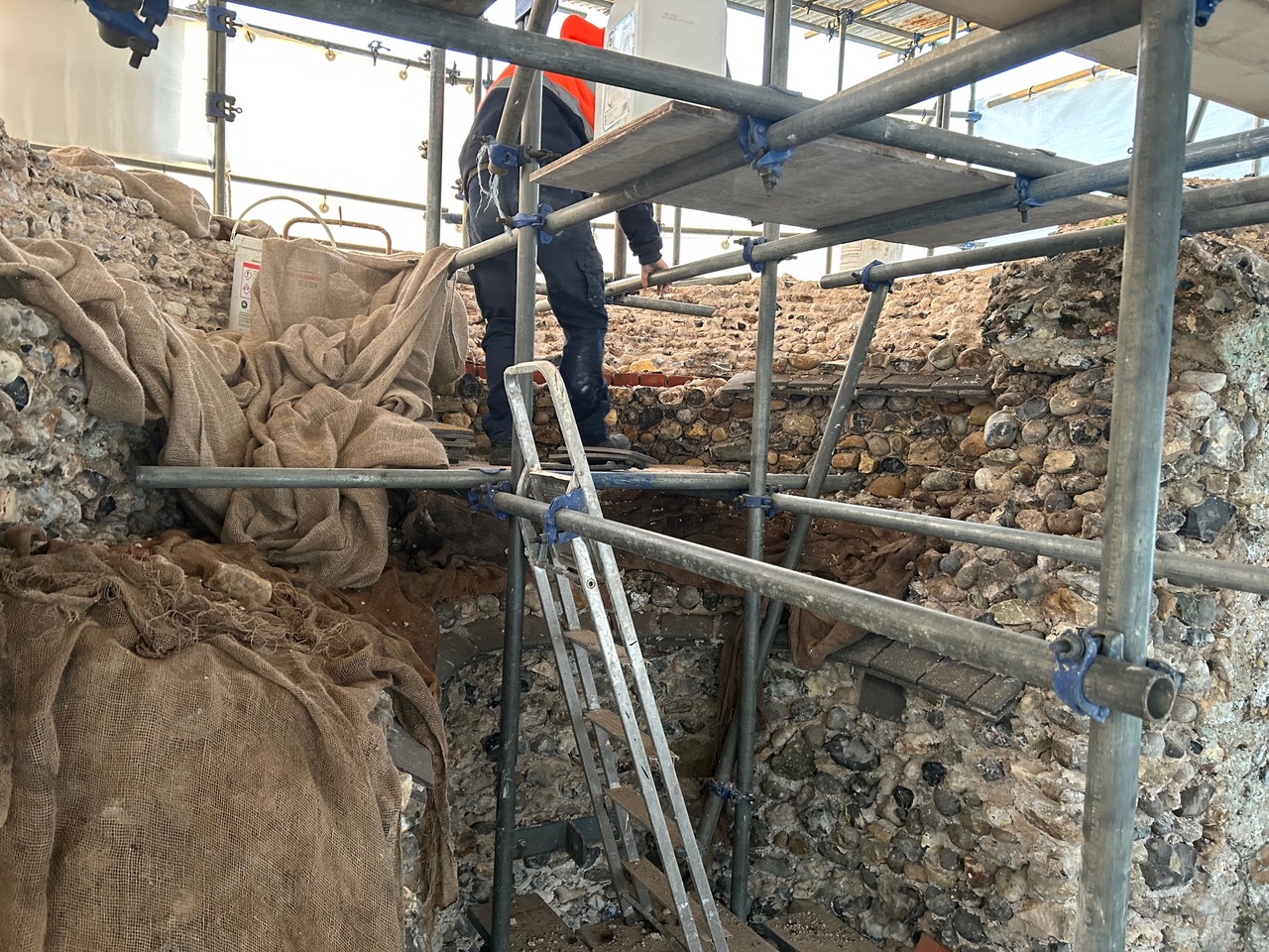 The Castle site had to be closed in 2023 as repair works needed to be completed to secure the Castle for the future, and to ensure it was safe for visitors to the site.The first phase of the major preservation project was commenced by Bungay Castle Trust in conjunction with specialist consultants in order that a satisfactory programme of works could be created and submitted to Historic England for approval. The Castle is listed as Grade 1 due to its historic interest, as it dates back to the site being fortified in 1070, anddeveloped further in the 12th & 13th centuries. As a result, the significant works proposed required Historic England approval, together with Scheduled Monument Consent, and for the approvals to be endorsed by the Secretary of State. This was achieved in2024, with the repair works then commencing in August on the north tower. For the works to proceed over winter months, the scaffolding on the tower was clad in protective sheeting, together with a roof. Without those measures, work through the winter would not have been practical.